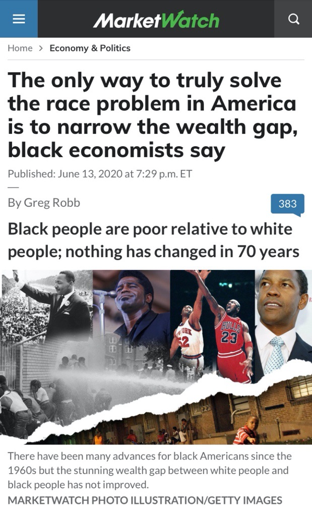△《市場觀察》報道,非裔經(jīng)濟學家表示,種族斗爭源于貧富差距