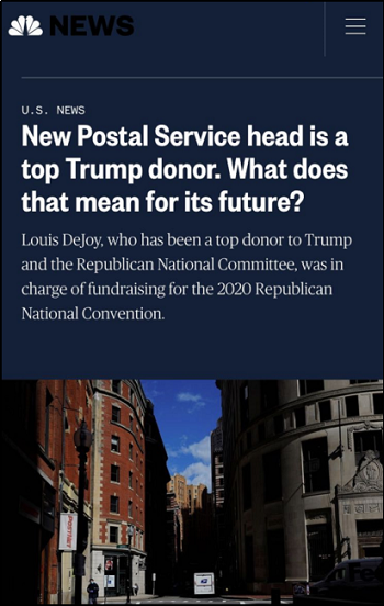 美國全國廣播公司指出,按程序規(guī)定,美國郵政局局長應(yīng)由該機(jī)構(gòu)董事會任命,以避免該中立的政府職能機(jī)構(gòu)被卷入政治紛爭。然而目前董事會所有成員均出自特朗普任命,這使德喬伊的指認(rèn)充滿政治傾向。此外,過去25年中,德喬伊曾經(jīng)營一家名為New Breed Corporation的物流和配送公司,當(dāng)其被上市公司XPO物流收購后,德喬伊作為企業(yè)高管在后者任職。而XPO同聯(lián)邦快遞、UPS作為美國三大物流公司,正是美國郵政局業(yè)務(wù)連年衰敗的主要原因。更有媒體指出,新任美國郵政局局長及其家人,在這些競爭對手機(jī)構(gòu)中坐擁高達(dá)7530萬美元的資產(chǎn)利益。