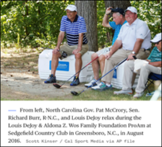 △路易斯·德喬伊(左三)與前北卡羅萊納州州長帕特·麥克羅里等人在北卡的鄉(xiāng)村俱樂部休閑(圖片來源:美聯(lián)社)