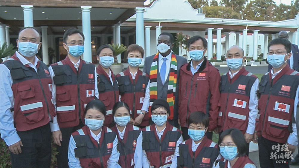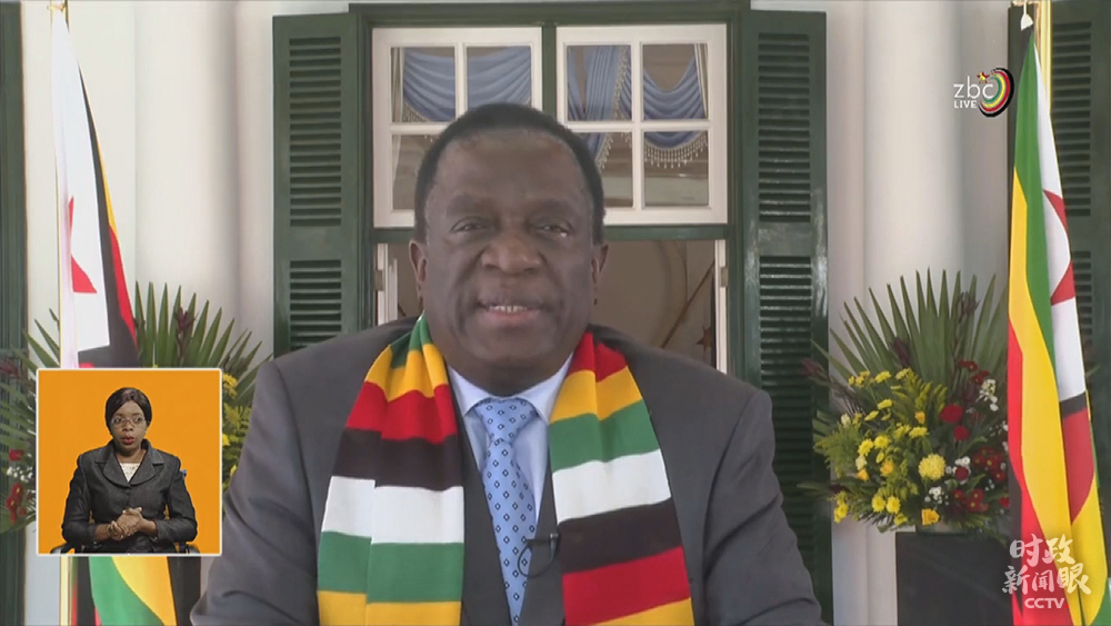 △5月12日,津巴布韋總統(tǒng)姆南加古瓦在總統(tǒng)府接見中國抗疫醫(yī)療專家組,并在國家電視臺發(fā)表講話時,再次感謝中國幫助津巴布韋抗擊新冠肺炎疫情。(總臺央視記者馬培敏提供)