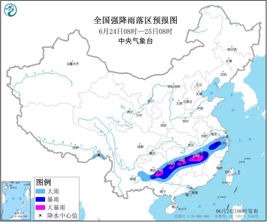 人民網(wǎng)北京6月24日電 中央氣象臺6月24日06時繼續(xù)發(fā)布暴雨黃色預(yù)警:預(yù)計,6月24日08時至25日08時,貴州南部、廣西北部、湖南中部、江西中北部、福建西北部、安徽南部、浙江中北部等地的部分地區(qū)有大到暴雨,其中,貴州東南部、廣西北部、湖南中部、江西中部等地局地有大暴雨(100~180毫米)。上述部分地區(qū)伴有短時強降水(最大小時降雨量30~60毫米,局地可超過70毫米),局地有雷暴大風(fēng)等強對流天氣。