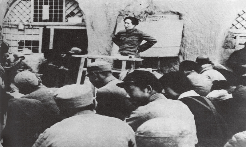 毛澤東非常重視理論聯(lián)系實(shí)際這一馬克思主義學(xué)風(fēng)的養(yǎng)成,強(qiáng)調(diào)必須始終堅(jiān)持把馬克思主義與中國(guó)實(shí)際緊密結(jié)合起來。圖為毛澤東在為陜北公學(xué)學(xué)員講課。