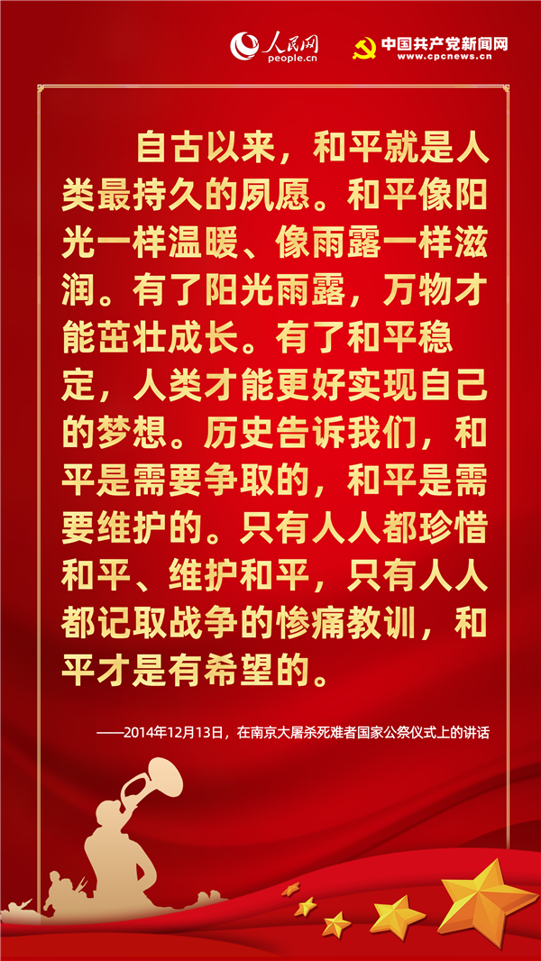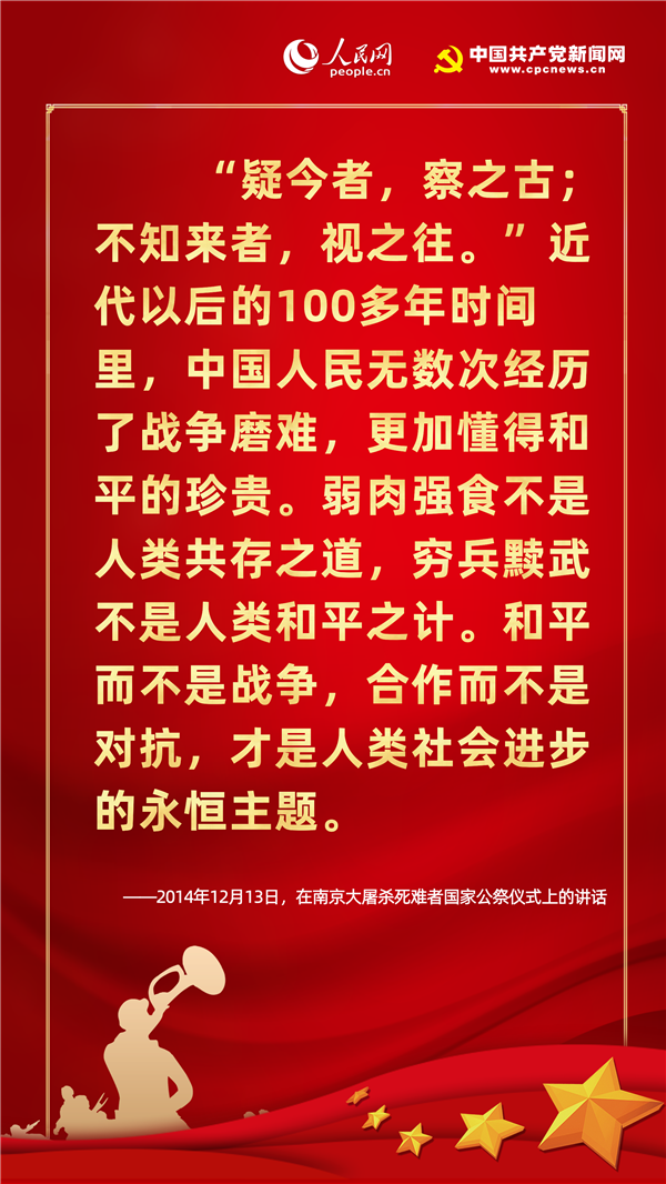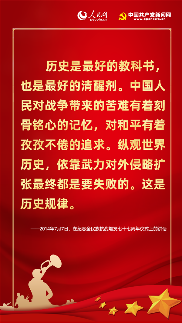 歷史不僅關(guān)乎過(guò)去,更關(guān)乎現(xiàn)在和未來(lái)。紀(jì)念歷史不是為了咀嚼苦難、延續(xù)仇恨,而是為了重申和平與正義的價(jià)值,從歷史中汲取智慧,獲得開(kāi)創(chuàng)未來(lái)的精神力量。在七七事變83周年的今天,人民網(wǎng)·中國(guó)共產(chǎn)黨新聞網(wǎng)梳理十八大以來(lái)習(xí)近平總書(shū)記有關(guān)“戰(zhàn)爭(zhēng)與和平”的重要論述,讓我們一起“銘記歷史、緬懷先烈、珍視和平、警示未來(lái)”。