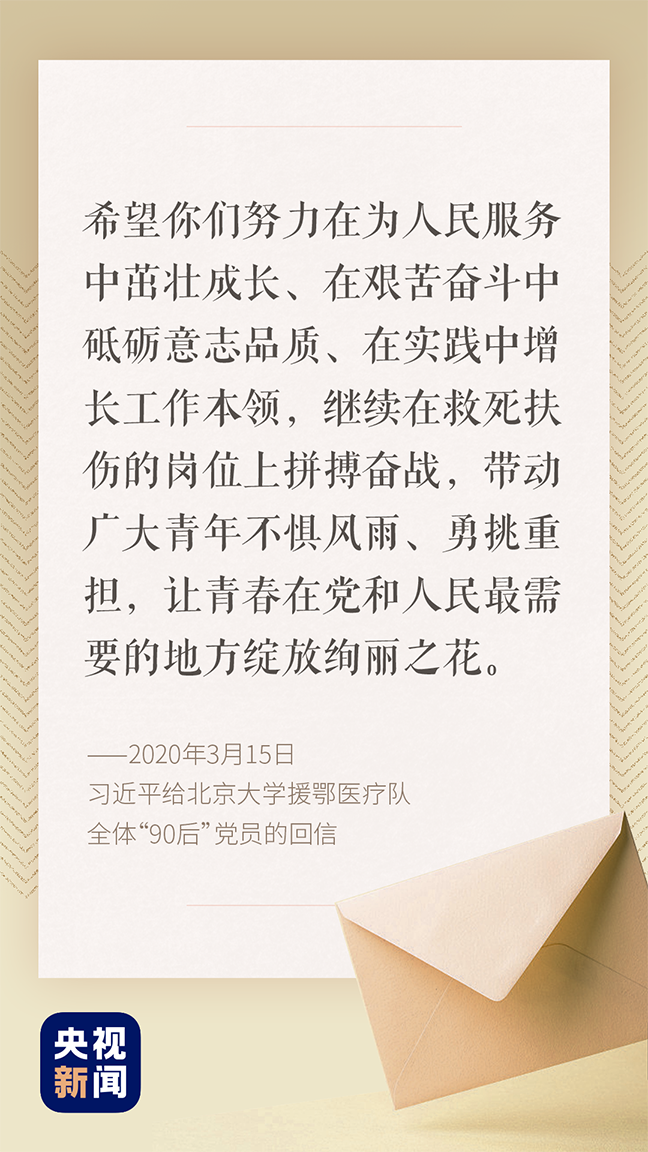 3月15日,習(xí)近平總書記給北京大學(xué)援鄂醫(yī)療隊(duì)全體“90后”黨員回信,向他們和奮斗在疫情防控各條戰(zhàn)線上的廣大青年致以誠摯的問候。