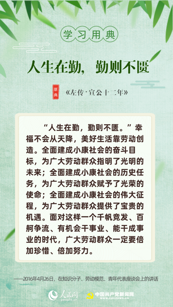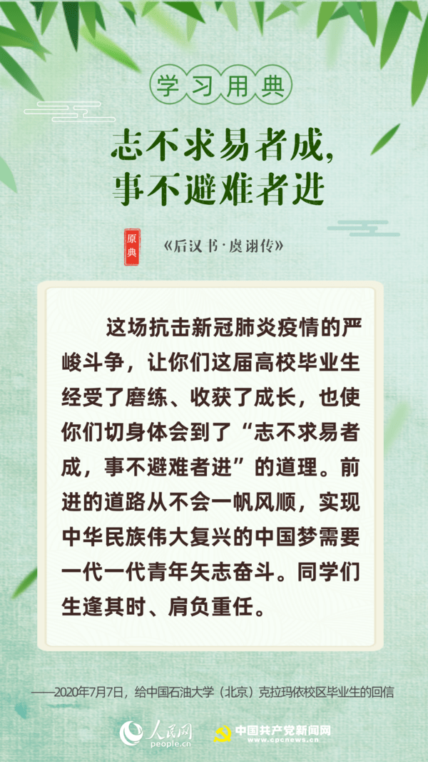 【編者按】“志不求易者成,事不避難者進!苯,習近平總書記給中國石油大學(北京)克拉瑪依校區(qū)畢業(yè)生回信,對廣大高校畢業(yè)生提出殷切期望!叭松谇冢趧t不匱”“積土而為山,積水而為海”……近年來,習近平多次引用詩句典故,激勵包含廣大青年在內(nèi)的全黨全國各族人民拼搏奮進、埋頭苦干。正值“戰(zhàn)疫”“戰(zhàn)貧”關鍵時刻,人民網(wǎng)·中國共產(chǎn)黨新聞網(wǎng)與您一起回顧習近平講話中關于“奮斗”的10個名句。