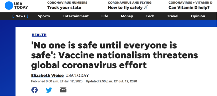 《今日美國》發(fā)文指出,世界卷入了一場混亂的疫苗研發(fā)競賽,這正是公共衛(wèi)生專家擔心的。為了本國公民獲取足夠的疫苗,“以我為主”的“民族主義”正在加大國家之間的對立,而不是促成廣泛的合作、協(xié)調(diào)和共享。