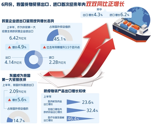 從月度走勢(shì)看,6月份我國(guó)進(jìn)出口同比增長(zhǎng)5.1%。其中,出口自4月份起連續(xù)3個(gè)月保持同比正增長(zhǎng);進(jìn)口也于6月份實(shí)現(xiàn)“轉(zhuǎn)負(fù)為正”,增長(zhǎng)6.2%。