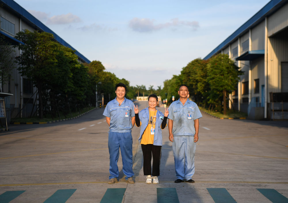 在佛山市三水區(qū)廣東星星制冷設(shè)備有限公司,來自四川涼山彝族自治州鹽源縣的貧困務(wù)工人員伍元國、易爭咪、董正軍(從左至右)下班后在廠區(qū)合影,他們通過東西部扶貧協(xié)作在這里實現(xiàn)就業(yè)(6月22日攝)。新華社記者鄧華攝