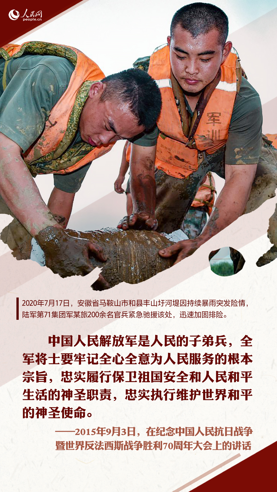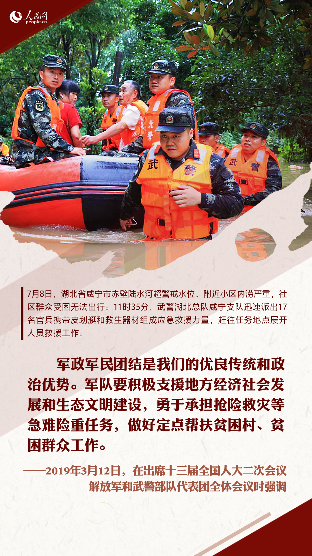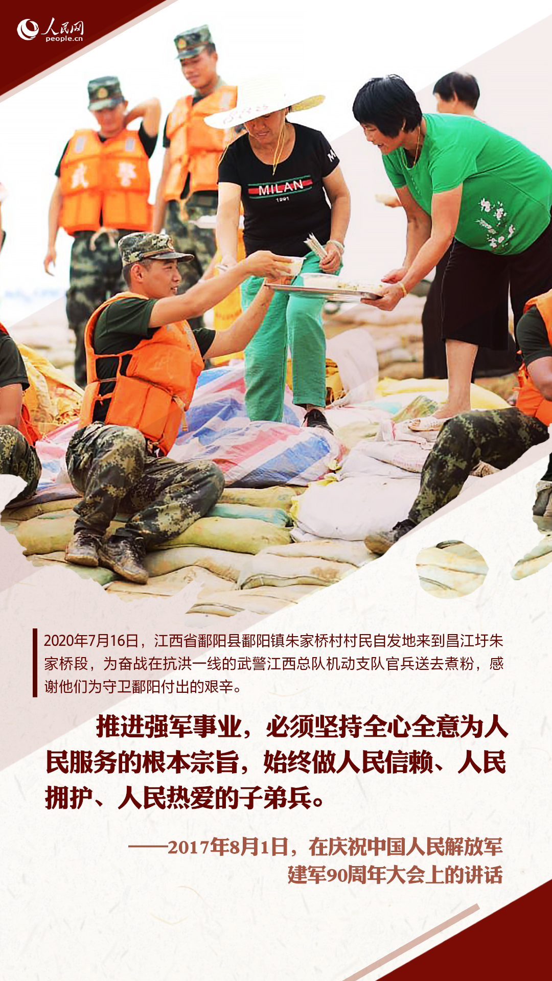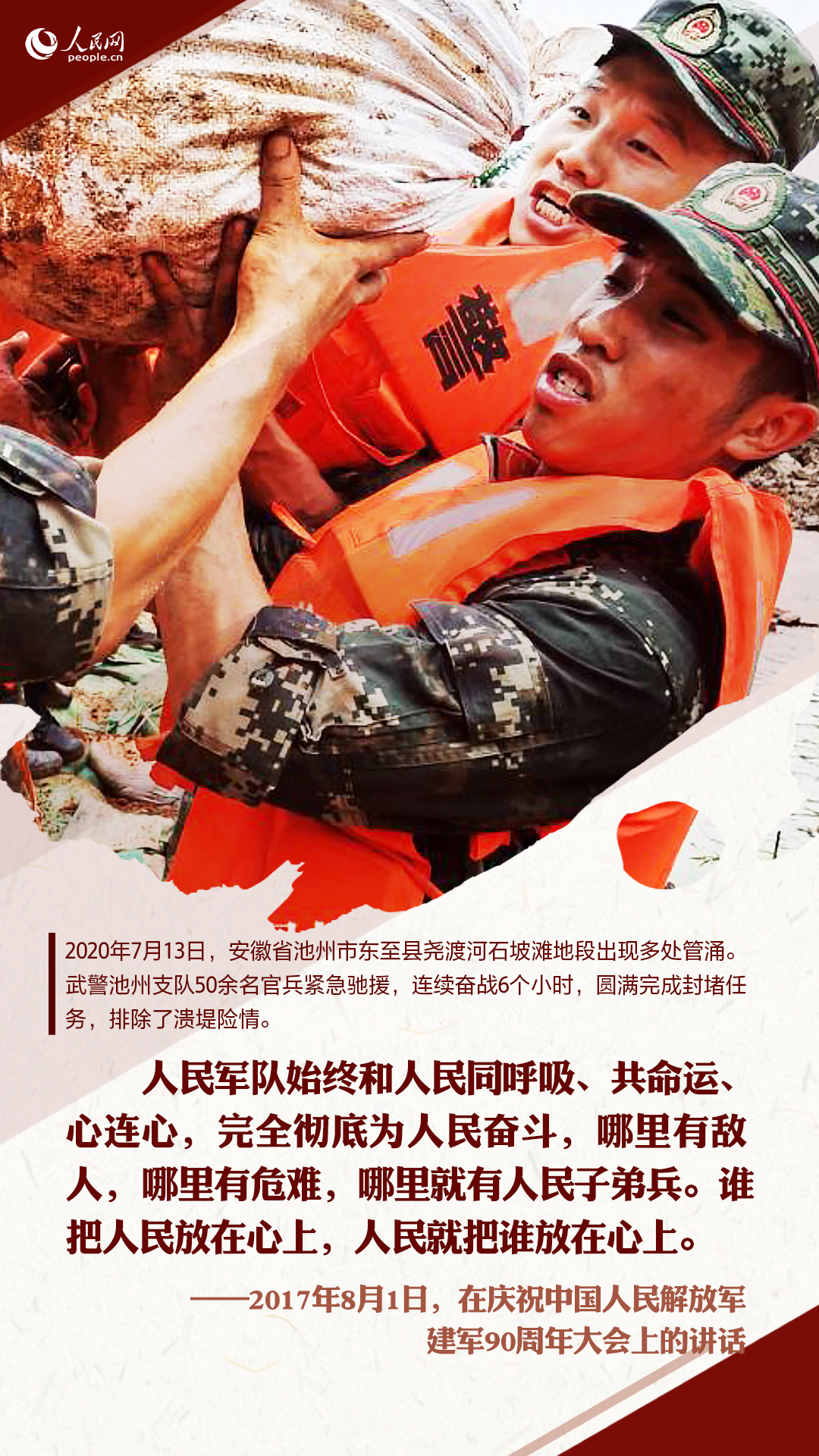 十八大以來,習(xí)近平在多個(gè)重要場(chǎng)合囑托人民子弟兵要全心全意為人民服務(wù)。這些話語,猶在耳畔,人民網(wǎng)圖解新聞制作一組海報(bào),重溫習(xí)近平的殷殷囑托,并致敬與洪水戰(zhàn)斗的人民子弟兵!