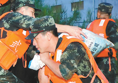 受持續(xù)強(qiáng)降雨影響,廣西賀州賀江水位急速上升,引發(fā)洪澇災(zāi)害。圖為武警官兵搬運(yùn)沙袋。張畢海攝(影像中國(guó))