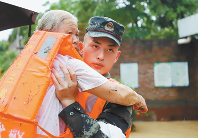 廣東清遠(yuǎn)市受連續(xù)強(qiáng)降雨影響,部分區(qū)域受災(zāi)嚴(yán)重。圖為源潭鎮(zhèn)蓮安村,武警官兵在轉(zhuǎn)移被困群眾。廖鍵攝(影像中國(guó))