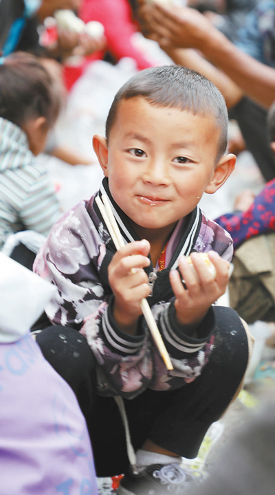四川冕寧縣發(fā)生特大暴雨災(zāi)害,武警涼山支隊(duì)官兵在多個(gè)安置點(diǎn)開展提供熱食、消毒防疫、巡診送藥和心理疏導(dǎo)等工作。圖為6月29日,一男孩在大馬烏村安置點(diǎn)吃早餐。李結(jié)義攝(影像中國(guó))