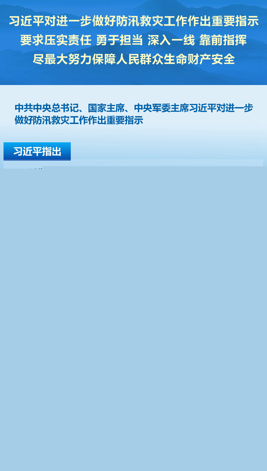 12日,習(xí)近平對進(jìn)一步做好防汛救災(zāi)工作作出重要指示強(qiáng)調(diào),全力搶險救援,盡最大努力保障人民群眾生命財(cái)產(chǎn)安全。