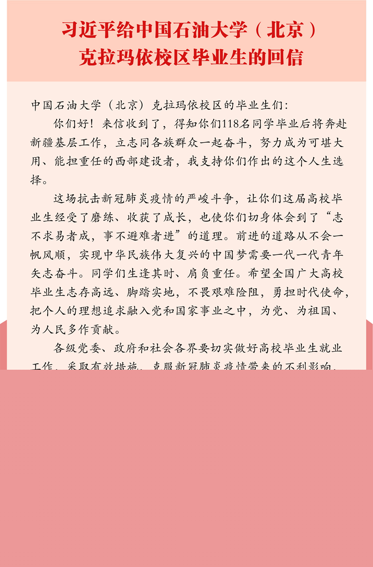 7月7日,在給中國石油大學(xué)(北京)克拉瑪依校區(qū)畢業(yè)生的回信中,習(xí)近平強(qiáng)調(diào),各級黨委、政府和社會各界要切實(shí)做好高校畢業(yè)生就業(yè)工作,采取有效措施,千方百計(jì)幫助高校畢業(yè)生就業(yè)。