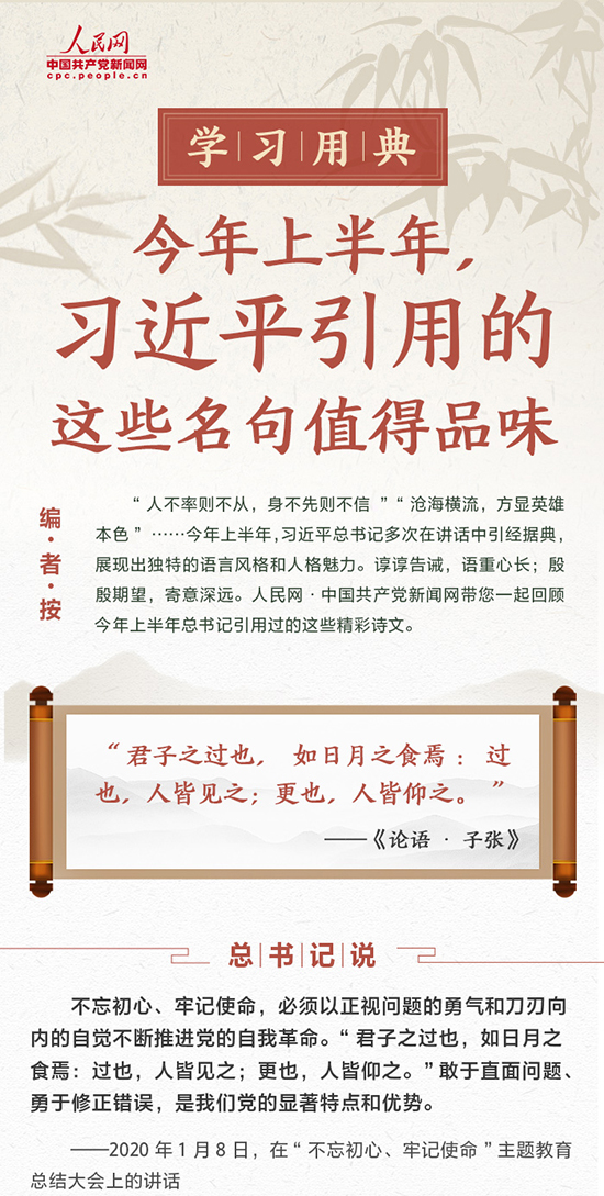 今天讓我們關(guān)注總書記上半年講話中引用的名句。>>>點擊查看名句解讀