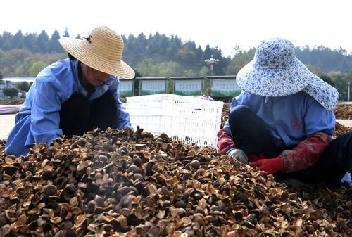 △在河南省信陽市光山縣一油茶基地,工作人員在分揀油茶果。