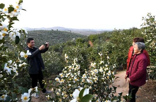 △在河南省信陽市光山縣司馬光油茶園,游客與油茶花合影。