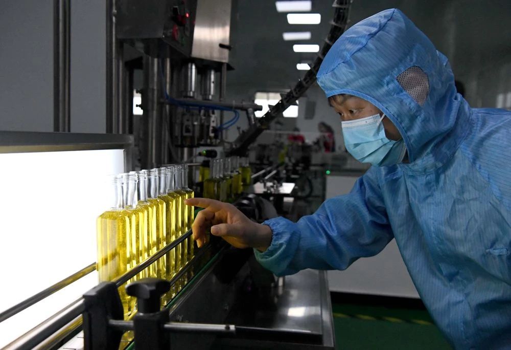 △3月27日,工作人員在河南省光山縣一家油茶加工企業(yè)的灌裝車間作業(yè)。