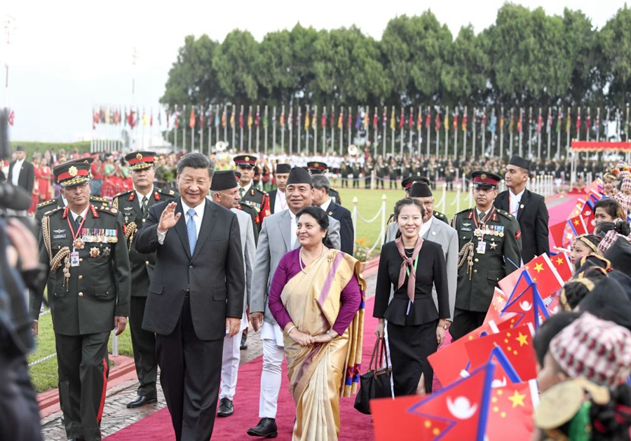 2019年10月12日,國家主席習(xí)近平乘專機(jī)抵達(dá)加德滿都,開始對尼泊爾進(jìn)行國事訪問。尼泊爾總統(tǒng)班達(dá)里在機(jī)場為習(xí)近平舉行具有濃郁尼泊爾民族特色的歡迎儀式。新華社記者 高潔 攝
