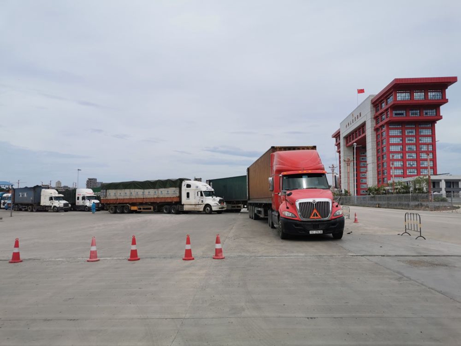 2020年6月8日,在廣西東興口岸,一批越南貨車在排隊(duì)候檢,準(zhǔn)備通關(guān)。 新華社發(fā)(林珉正 攝)