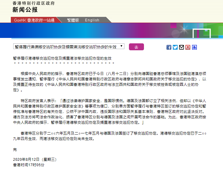 根據(jù)中央人民政府的指示,香港特區(qū)政府已于今日(8月12日)分別向德國(guó)駐香港總領(lǐng)事館及法國(guó)駐港澳總領(lǐng)事館發(fā)出通知,暫停履行《中華人民共和國(guó)香港特別行政區(qū)政府與德意志聯(lián)邦共和國(guó)政府關(guān)于移交逃犯的協(xié)定》,以及擱置正待生效的《中華人民共和國(guó)香港特別行政區(qū)政府與法蘭西共和國(guó)政府關(guān)于移交被控告或被定罪人士的協(xié)定》。