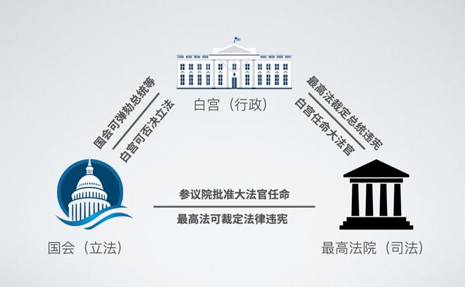 眾所周知,“美國政治制度是行政、立法、司法三權(quán)分立,總統(tǒng)、國會(huì)與最高法院及其相關(guān)機(jī)構(gòu)各司其職,相互制衡!