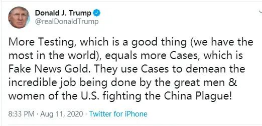 對于正全力爭取連任的美國總統(tǒng)特朗普來說,本國疫情的失控已經(jīng)成了他最大的一塊心病。為此,他日前再發(fā)推文,為自己的抗疫不力辯護:“更多的病毒檢測雖然是件好事,但也等于出現(xiàn)了更多病例,而這會給媒體制造‘假新聞’提供炮彈,詆毀美國人為應對‘中國瘟疫’所做出的偉大努力!