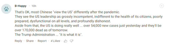 不過,從美國網(wǎng)民的反對聲來看,越來越多的明眼人已經(jīng)對這類抹黑說辭有了免疫力。有網(wǎng)友就接著特朗普的話反唇相譏:“在疫情大流行之后,大多數(shù)中國人對美國的看法也不同了。”