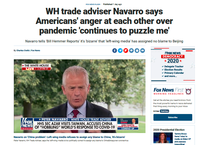 特朗普的一眾得力干將們也沒閑著。幾乎就在這位總統(tǒng)大肆污名化中國的同時,白宮國家貿(mào)易和制造業(yè)政策辦公室主任彼得·納瓦羅也再次借疫情給中國潑臟水。他在接受?怂剐侣劜稍L時稱,美國人對新冠肺炎疫情的憤怒主要是針對美國同胞,而不是轉向中國,這讓他“困惑”。