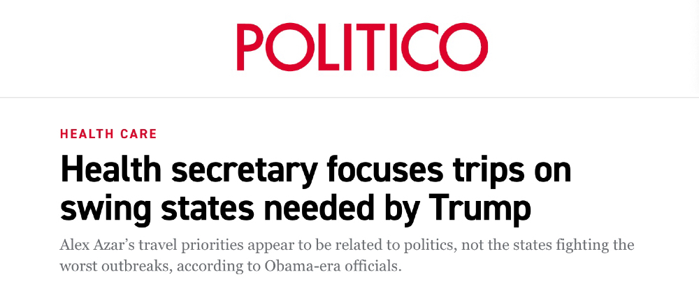 奧巴馬時期的官員就曾指出,阿扎出行地點的選擇似乎優(yōu)先考慮的是政治因素,而不是疫情嚴重程度。據(jù)美國政治新聞網(wǎng)站Politico報道,自4月下旬以來,阿扎的11次出行當中,有9次的目的地都是總統(tǒng)特朗普急需爭取選票的“搖擺州”。