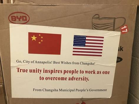 據《首都公報》報道,一些口罩于8月份抵達安納波利斯市,其中一個包裝箱上印有中國和美國國旗,上面寫著:“加油,安納波利斯!來自長沙的祝福!真正的團結鼓舞人們齊心協(xié)力克服困難!