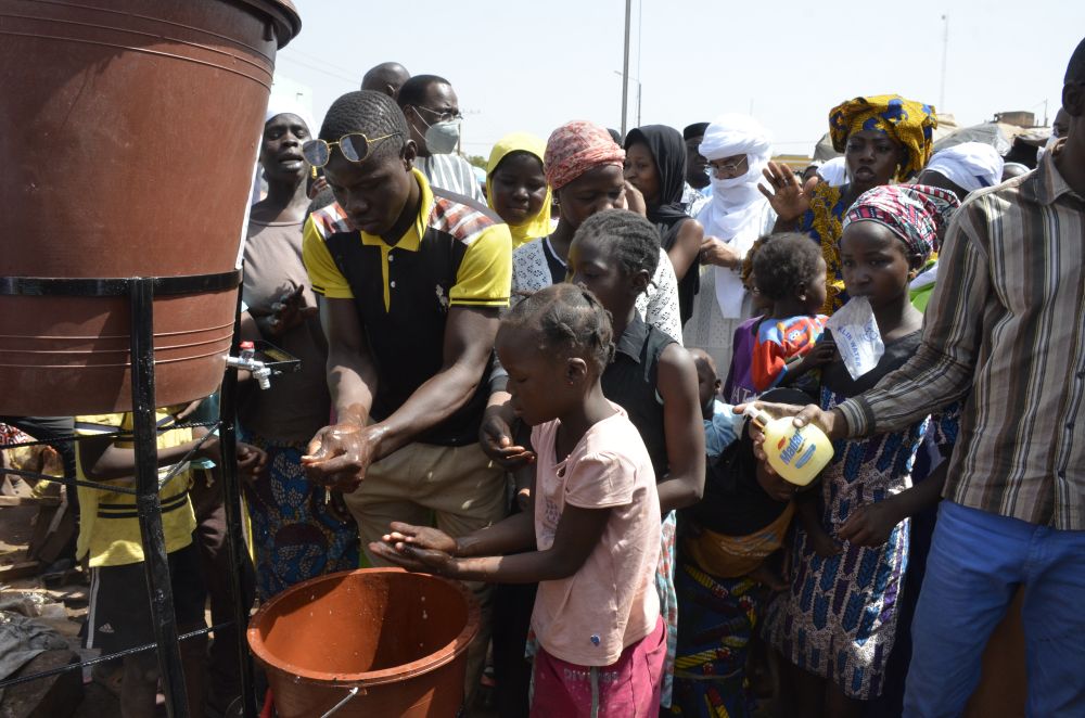 4月3日,人們在馬里首都巴馬科市中心的一處市場的洗手裝置處洗手。新華社發(fā)(哈比卜·庫亞特?cái)z)