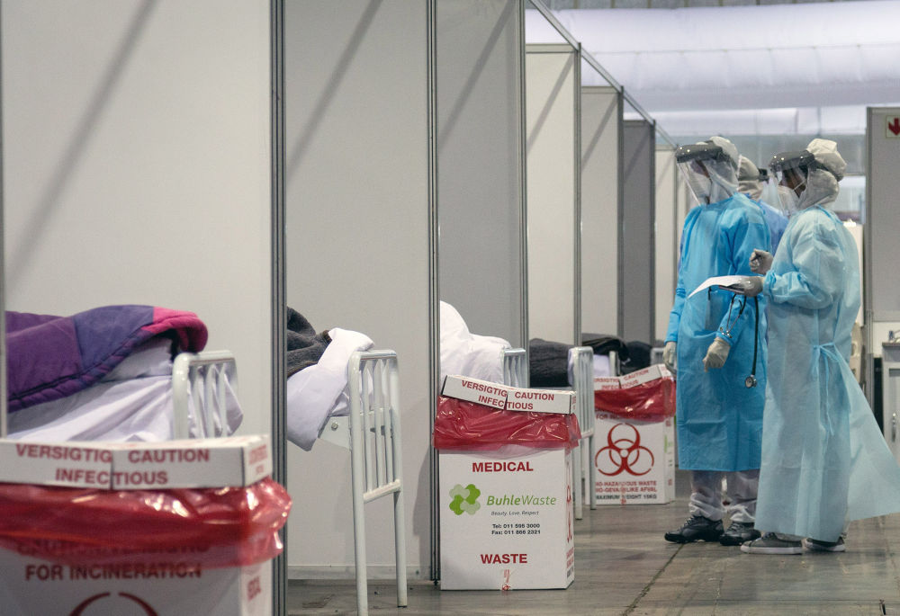 7月3日,醫(yī)護(hù)人員在南非約翰內(nèi)斯堡隔離中心內(nèi)詢問病情。新華社發(fā)(耶希爾攝)