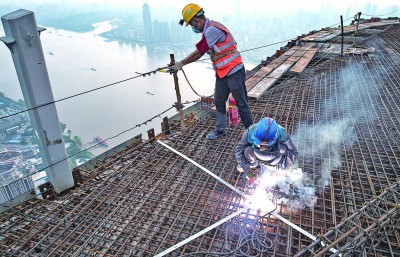 日前正值高溫天氣,在湖北武漢綠地中心項(xiàng)目建設(shè)現(xiàn)場近五百米高的“云端”,三百多名中建三局二公司的工人揮汗如雨,伴著腳下的長江波濤,穩(wěn)步推進(jìn)工程建設(shè)。這些建設(shè)者中有不少參與過武漢火神山、雷神山醫(yī)院的建設(shè)。工人們每天早晨六點(diǎn)開工,中午最熱的時(shí)候稍事休息,直到天黑才收工回到地面。新華社記者 肖藝九攝