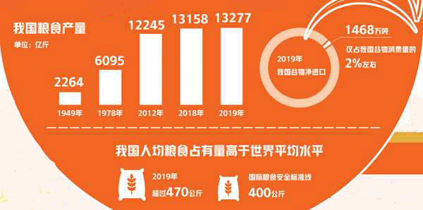 程國強:解決好吃飯問題,是中國人千百年來夢寐以求的目標(biāo)。新中國成立后特別是改革開放以來,在中國共產(chǎn)黨的領(lǐng)導(dǎo)下,我國經(jīng)過艱苦奮斗和不懈努力,在農(nóng)業(yè)基礎(chǔ)十分薄弱、資源條件極其有限的基礎(chǔ)上,依靠自身力量,實現(xiàn)了由“吃不飽”向“吃得飽”,進(jìn)而追求“吃得好”的歷史性轉(zhuǎn)變。這既是世界糧食安全的巨大成就,也是全球農(nóng)業(yè)的歷史奇跡。統(tǒng)計數(shù)據(jù)顯示,1949年,我國糧食產(chǎn)量只有1.1318億噸左右,人均糧食占有量只有209公斤;2019年,我國糧食產(chǎn)量已經(jīng)連續(xù)多年突破6.5億噸,人均糧食占有量上升至470公斤,比新中國成立時的209公斤增長了126%,高于世界平均水平。目前,我國谷物自給率超過95%,水稻和小麥兩大口糧自給率超過100%,中國人已經(jīng)將“飯碗”牢牢端在了自己手上。