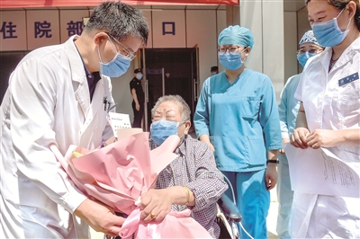 經歷了98天的救治后,新冠肺炎危重癥患者、79歲的馬奶奶成功脫離體外人工膜肺(ECMO),從北京地壇醫(yī)院康復出院。圖為出院當日,馬奶奶向醫(yī)生獻花表示感謝。新華社記者 彭子洋 攝