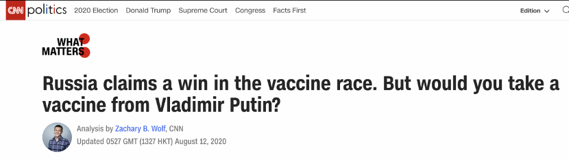 美國(guó)有線電視新聞網(wǎng)(CNN)12日在報(bào)道中拋出一連串疑問:“俄羅斯宣稱贏得疫苗競(jìng)賽,但是普京的疫苗你會(huì)用嗎?”《紐約時(shí)報(bào)》發(fā)文聲稱,俄羅斯正陷入全球疫苗爭(zhēng)奪賽中,普京總統(tǒng)將這場(chǎng)競(jìng)賽視為個(gè)人領(lǐng)導(dǎo)力和國(guó)家制度的優(yōu)劣對(duì)比。