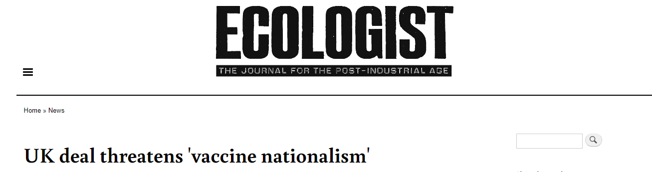 英國(guó)《生態(tài)學(xué)家》雜志18日發(fā)表一篇標(biāo)題為《英國(guó)疫苗協(xié)議:“疫苗的民族主義”》的社論。文章認(rèn)為,英國(guó)與美國(guó)醫(yī)藥企業(yè)的疫苗協(xié)議威脅到了疫苗全球分配的公平性。