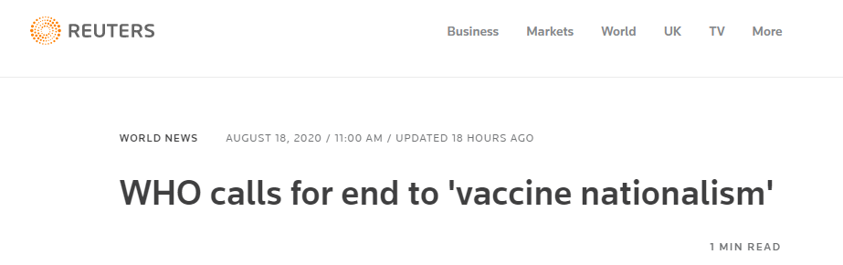 目前,全球新冠疫情依然嚴(yán)峻,上百種疫苗進(jìn)入不同的測(cè)試階段,有望在不久的將來(lái)面世。在此期間,英美等一些發(fā)達(dá)國(guó)家與制藥企業(yè)簽訂協(xié)議,以保證本國(guó)疫苗優(yōu)先供應(yīng)。批評(píng)人士稱(chēng),這種“本國(guó)優(yōu)先”的做法正在助長(zhǎng)“疫苗民族主義”風(fēng)氣,導(dǎo)致富裕國(guó)家爭(zhēng)相囤積新冠疫苗,而貧窮國(guó)家卻一劑難求。