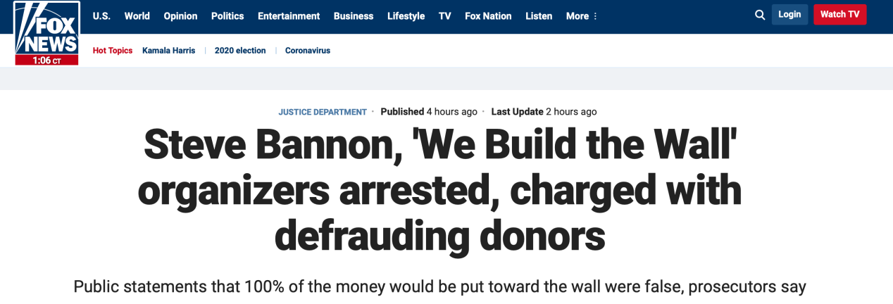 紐約曼哈頓地檢署的這份訴狀中稱,班農和科爾法奇曾對大眾表示,該組織是一個“志愿性組織”,籌得的款項將全部用于筑墻。此外,二人還屢次宣稱他們將不會“拿走籌得款項中的一分錢”。據NBC新聞報道,科爾法奇曾數次公開表示:“我不可能拿走里面的錢,它們不屬于我!