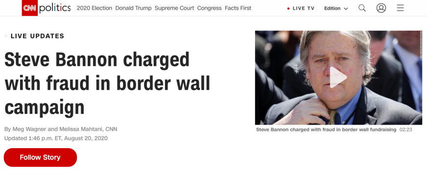 △CNN報道稱,史蒂夫·班農因“建墻”項目而被指控欺詐