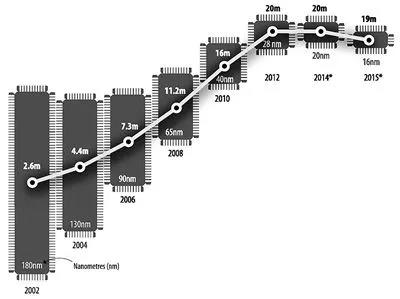 為了衡量芯片的技術進步,行業(yè)內(nèi)用了“制程”這個概念,隨著芯片上晶體管的尺寸減小,制程也就越小,芯片上能容納的晶體管數(shù)量就越多,也就是說制程越小,芯片的性能就越好。
