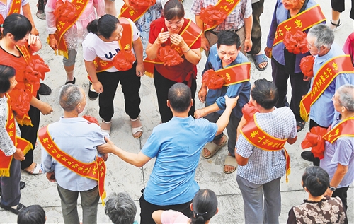 ▲陜西省漢中市洋縣龍亭鎮(zhèn)柳山村一組建檔立卡貧困戶周崇華(中后右二)在黨員干部的幫扶下,勤勞創(chuàng)業(yè),發(fā)家致富,被評(píng)為“脫貧民星”,在表彰會(huì)現(xiàn)場(chǎng),村民你拉我拽爭(zhēng)著和他合影。近年來,該村定期在全村開展脫貧民星、文明家庭、致富帶頭人等各類先進(jìn)典型評(píng)選表彰,激勵(lì)廣大村民奮發(fā)有為,增收致富,爭(zhēng)先創(chuàng)優(yōu)。