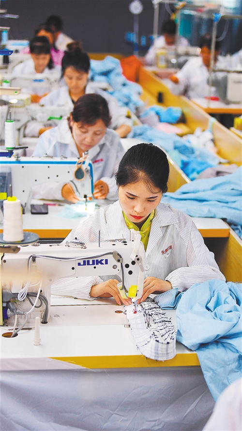 ▼洋縣朱鹮時(shí)裝工廠來自柳山村一組的貧困戶周錦(中前一)正忙著加工服裝。她在該企業(yè)上班年收入2萬多元,實(shí)現(xiàn)就業(yè)增收。