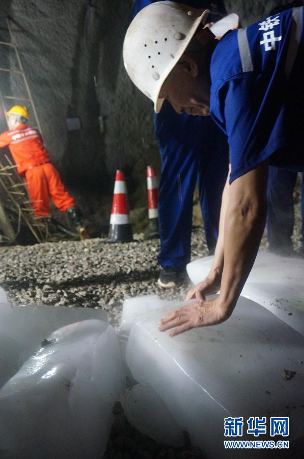 隧道內(nèi)的溫度高達(dá)40攝氏度,結(jié)束作業(yè)的工人在用冰塊降溫。新華網(wǎng)記者劉瓊 攝