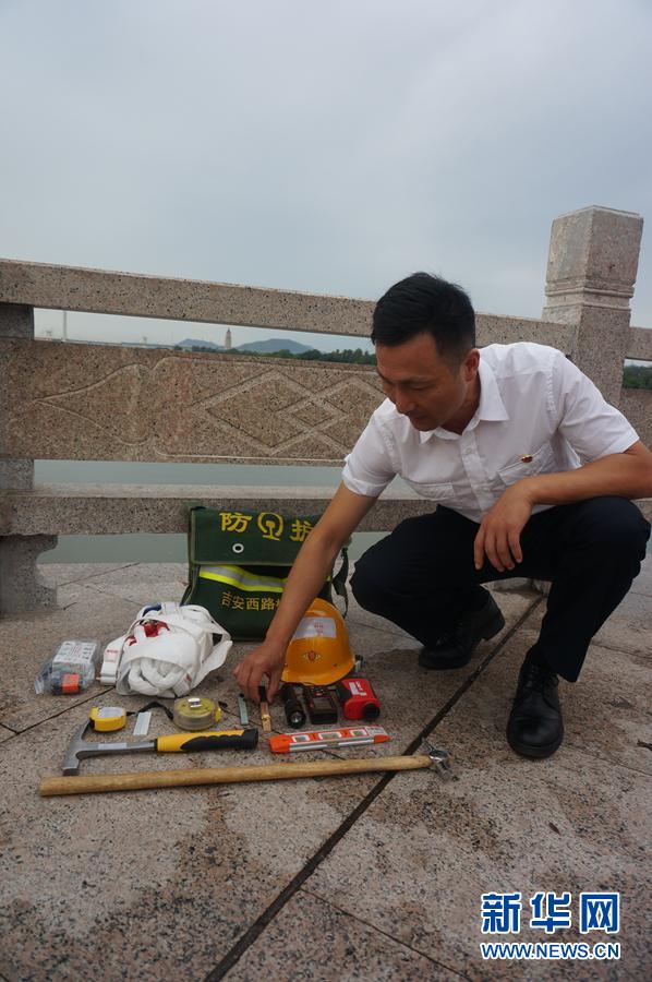 8月19日,路橋?qū)I(yè)工程師張宏斌介紹工具袋里的檢修工具。新華網(wǎng)記者劉瓊 攝