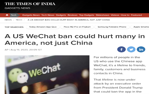 《印度時(shí)報(bào)》近日?qǐng)?bào)道指出,美國(guó)的微信“禁令”可能不僅傷害中國(guó),還會(huì)傷害很多在美人士。