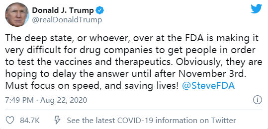 當(dāng)?shù)貢r(shí)間8月22日,特朗普在社交媒體上“炮轟”美國食品藥品監(jiān)督管理局(FDA),指責(zé)該機(jī)構(gòu)“有人故意拖延疫苗試驗(yàn)”,推遲新冠疫苗和藥物療法的開發(fā),導(dǎo)致可能要到11月大選過后才會有疫苗。他在這篇推文中還特意“點(diǎn)名”該機(jī)構(gòu)局長斯蒂芬·哈恩。
