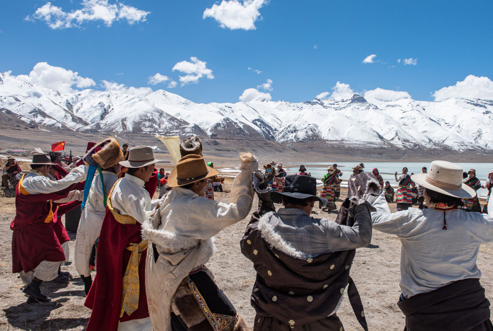 雪域高原上,村民們?cè)诖焊涠Y上跳鍋莊舞(4月30日攝)。新華社記者 田金文 攝