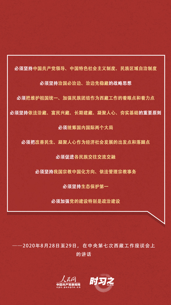 面對(duì)西藏工作面臨的形勢(shì)和任務(wù)的深刻變化,習(xí)近平在中央第七次座談會(huì)上強(qiáng)調(diào):“新時(shí)代黨的治藏方略是做好西藏工作的根本遵循,必須長(zhǎng)期堅(jiān)持、全面落實(shí)!睂(duì)此,習(xí)近平提出了10個(gè)“必須”——
